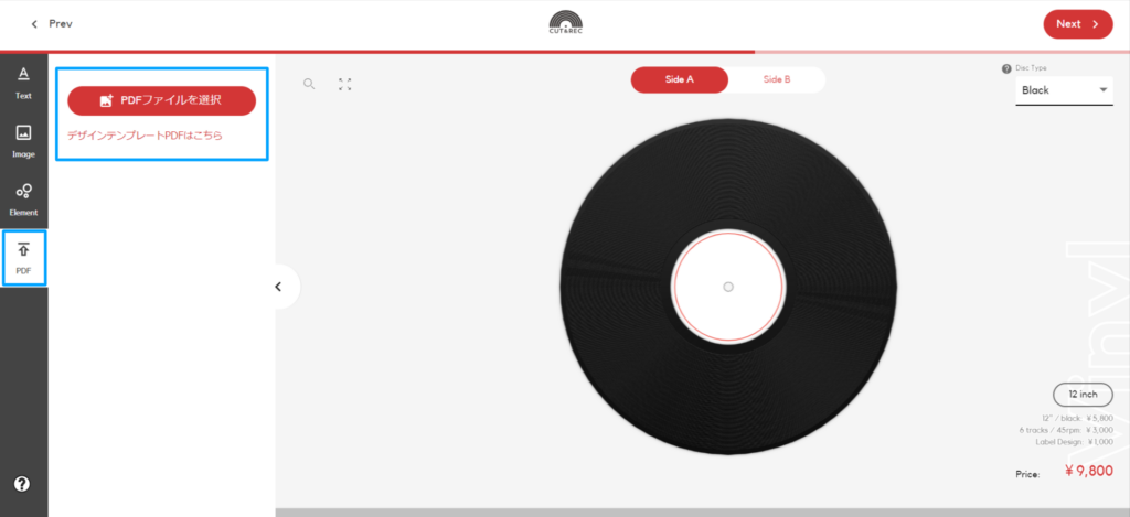 PDF形式で書き出したデザインファイルを用意し、デザイン入稿画面の左のデザインツール内PDFボタンをクリックしたのち、デザインテンプレートにてデザインしたPDFファイルを反映させてください。